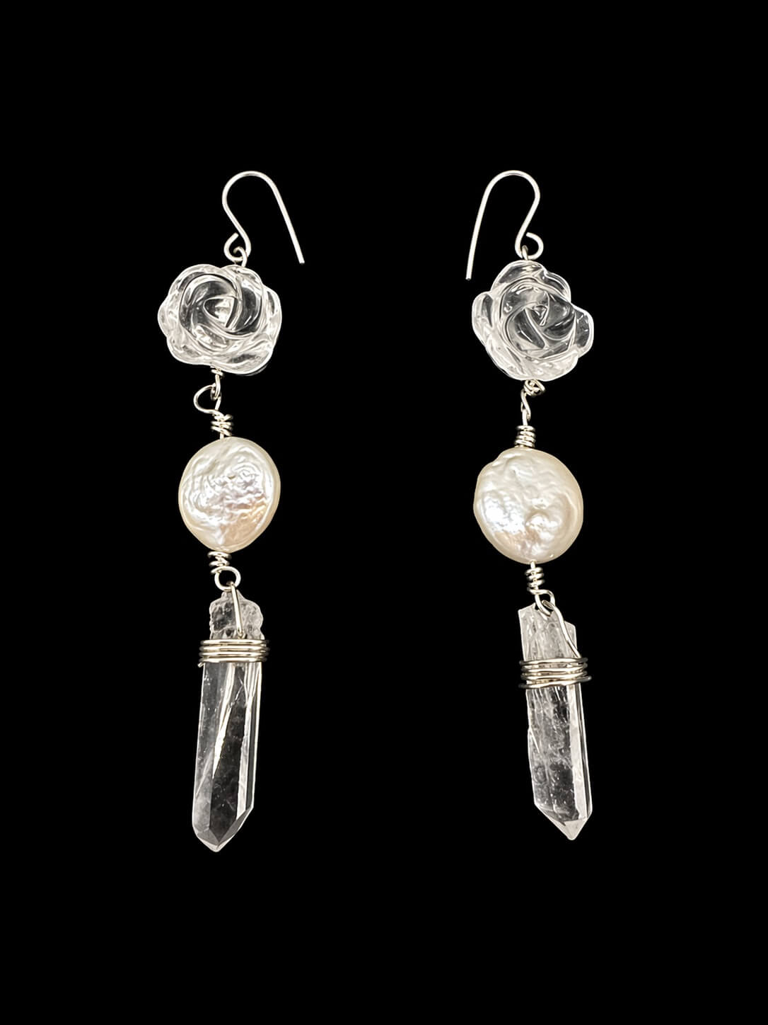 Clear quartz carved rose with freshwater pearl and clear quartz point