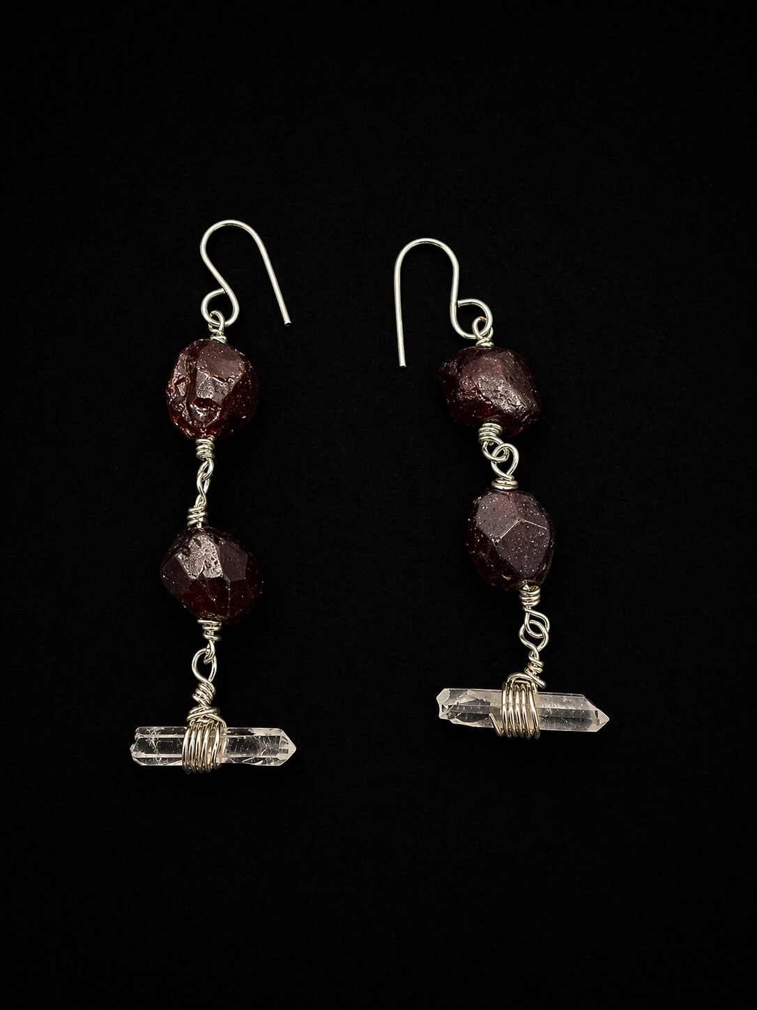 Earrings of garnet and clear quartz